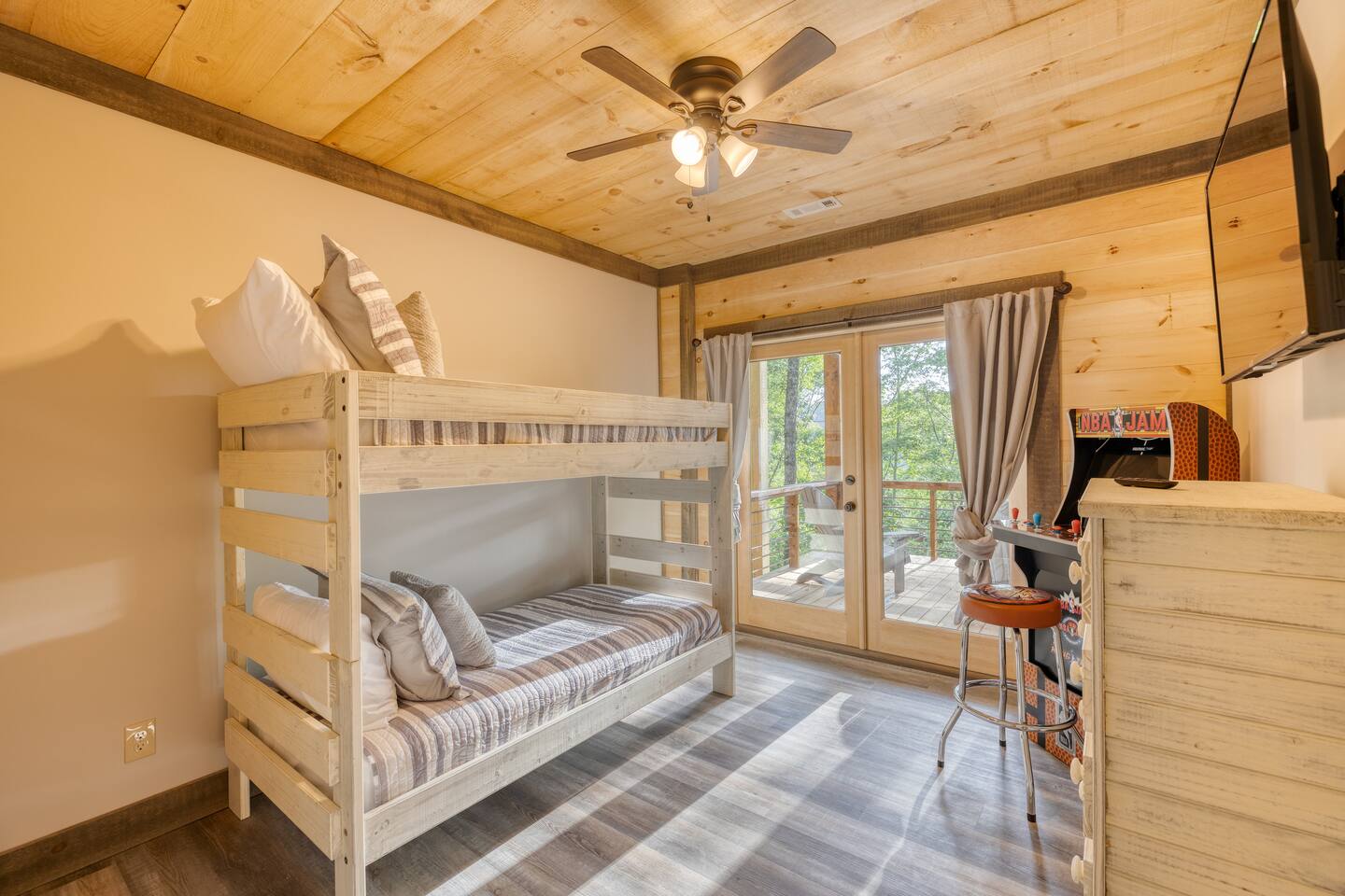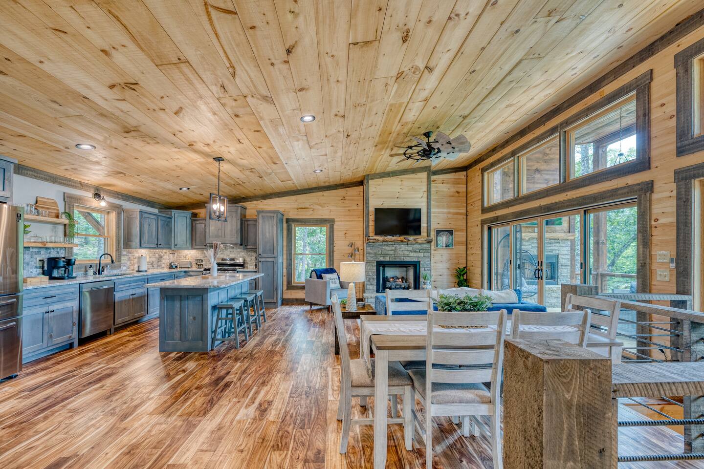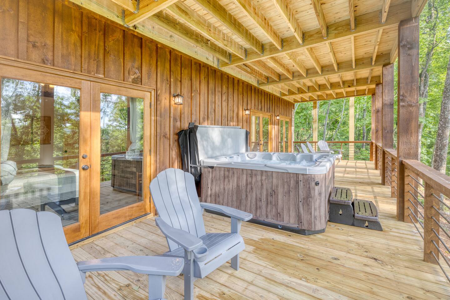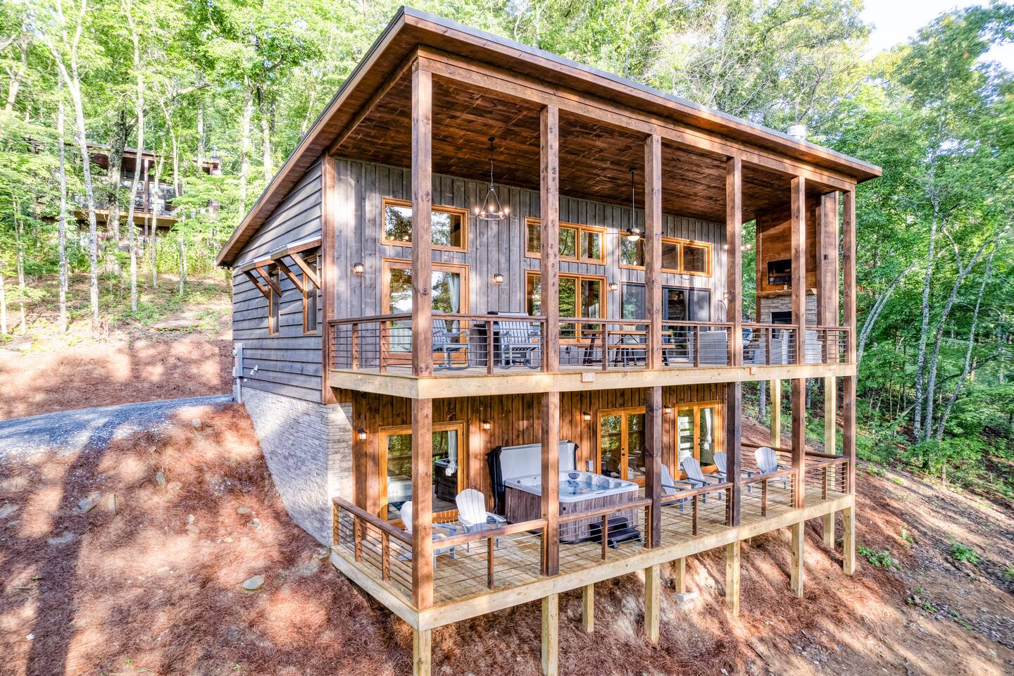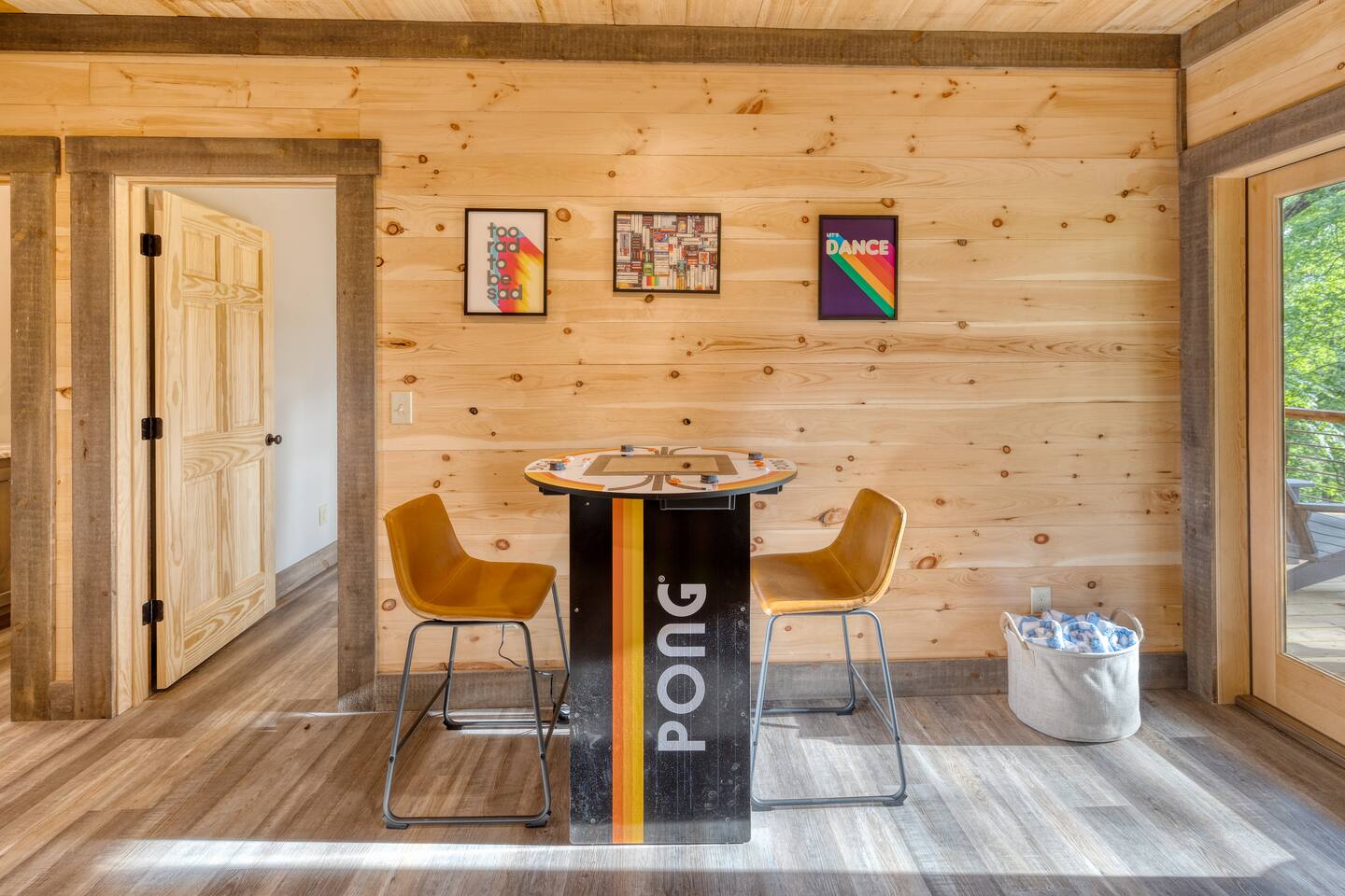 KEY HIGHLIGHTS • 3 Bed/3.5 Bathroom Chalet - Sleeps 8 guests • Forest Views • Keyless Entry • NEW! Level-2 ChargePoint EV charger (50A) on site - perfect for overnight charging. • Recently paved driveway (Nov'25) • Outdoor Hot Tub • Super-fast Wifi (500 mbps) • Gas fire pit (lower deck) • Outdoor wood-burning fireplace (upper deck) • Indoor gas fireplace • Retro-inspired rec room • Infinity Game Table (touch screen w/ Scrabble, Yahtzee, chess, etc. +200 games) • Pong arcade & NBA Jam arcade • Complimentary bathroom amenity kits (soap, shampoo, conditioner, body wash and lotion provided) • Roku Smart TVs (bring your own logins) • Fully-equipped kitchen • Washer / dryer with detergent • Central AC & heat • Outdoor dining & living areas • BBQ grill (gas) • Parking for ~3 vehicles (2 is most comfortable) • Dog Friendly (2 max, 75 lb. limit) • 15 Minutes from Blue Ridge Game Room | Forest & Seasonal Mountain Views | Hot Tub | Smart TVs in Each Bedroom | 2,400 Sq Ft | Pet-Friendly BLUE RIDGE MOUNTAINS LOCATION The Bluff Haus is tucked away in the woods in Mineral Bluff, Georgia – right by the charming town of Blue Ridge and the spectacular Blue Ridge Mountains. Located 90 miles north of Atlanta and an easy drive from Nashville and Charlotte, Blue Ridge is the kind of place that lets you escape from it all. Here in the Appalachian foothills, you can hike, bike, fish and chase waterfalls among lush mountains that take on a blue-ish hue from afar. The Toccoa River is great for kayaking, tubing and canoeing while whitewater rafting adventures abound on the Ocoee River a bit further north. Over at Lake Blue Ridge, pontoon boats and paddle boards are available for lazy days at the lake. And when you want to pick it up a notch, you can zipline among trees or tackle an aerial obstacle course at Blue Ridge Adventure Park. The town of Blue Ridge is an artsy destination with quaint shops, antique stores, art galleries, restaurants and craft breweries. We especially love Bin 322 for tapas and wine, as well as Harvest on Main which sources regional ingredients for its Southern cuisine. Right from town, jump on the historic Blue Ridge Scenic Railway which follows the Toccoa River north to the old copper mining town of McCaysville. Eat and shop along the scenic riverwalk or head to Deep Roots Orchard for picnics, wagon rides and campfire cookouts. FOREST DECKS The backyard is a woodland dream with leafy trees everywhere you turn. Our two covered decks invite you to relax and take in all the Appalachia beauty around you. And no houses are visible from the decks – just the woods await you. The upper deck has an outdoor living room with cushioned furniture, a hanging egg chair and a grand stone fireplace with a smart TV. The deck also offers a BBQ grill and farmhouse table where you can linger over picnic lunches and Southern-style cookouts. Two gray rocking chairs offer an old-school way to marvel at the enchanting view before you. On the lower deck, a roomy hot tub (it seats 6 people) is the ultimate place to unwind after a day of adventuring. You can also kick back among 6 Adirondack chairs as you share stories from your day. And once night falls, hanging string lights cast a soft, magical glow over both decks. Take in a deep breath and let out an “Aaaaah.” This is the good life. Enjoy our fire pit that’s made for campfire stories and gooey s’mores. OPEN LIVING, KITCHEN & DINING AREAS Our open-concept living room, kitchen and dining area evoke a treehouse that’s all grown up. One with knotty pine walls and ceilings plus a window wall with treetop views. The living room opens to the upper deck and is where you’ll want to cozy up among comfy furniture and another beautiful stone fireplace. The contemporary blue couch offers a queen-size pull-out sleeper sofa. The kitchen is our favorite part of the house, complete with blue-gray cabinets, a stone backsplash and marbled granite countertops. An iron chandelier pulls together the lovely farmhouse feel of the entire space. Use the Keurig Duo machine to brew fresh single-serve coffee (8 complimentary K-Cups provided) or brew a whole drip pot for your group. And with stainless steel appliances, a fully-stocked kitchen, and cookware aplenty, you’ll have what you need to make everything from stovetop popcorn to Sunday supper (we even offer a spice rack, kids dish sets, and dishwasher pods). An island offers even more counter space and 3 stools where you can saddle up for a pancake breakfast. And a farmhouse dining table which seats 6 people is just steps away. REC ROOM A rec room on the downstairs floor comes with a lot of fun amenities. A cozy den with oversized arm chairs and ottomans is accompanied by a wet bar, video games and digital board games. A retro striped wallpaper mural on one wall lends a ‘70s vibe to the entire room. And the games are equally throwback. A Pong game table has eight classic Atari video games – from the landmark Pong to Tempest and Super Breakout – that up to 4 people can play. With our Infinity Game Table, you can play digital versions of your favorite board games: Monopoly, Scrabble, Yahtzee, Candy Land, Battleship, Chutes and Ladders, chess, checkers and over 200 more. When the time comes for a screen break, sliding glass doors open to the fresh air of the lower deck where you can de-stress in the hot tub. 3 BEDROOMS Our three bedrooms are peaceful retreats with large picture windows and forest views. All 3 rooms offer glass doors that open to the decks. You’ll find rocking or Adirondack chairs outside your room which are great for morning coffee or a nightcap before bed. White-washed and reclaimed wood furniture is joined by country bedding in soothing hues of white, gray and blue. There are also Roku smart TVs in every room (bring your own logins). The bunk bed room also includes an NBA Jam arcade. Bedroom 1 – King bed (master) upstairs, en suite bathroom Bedroo