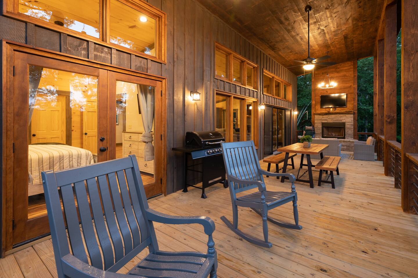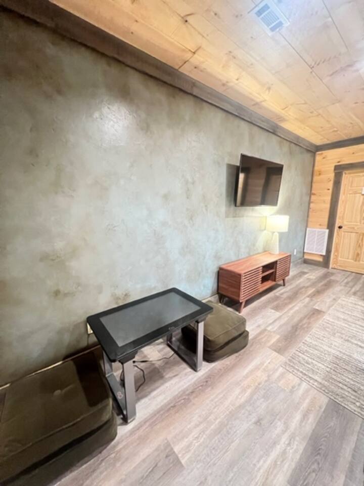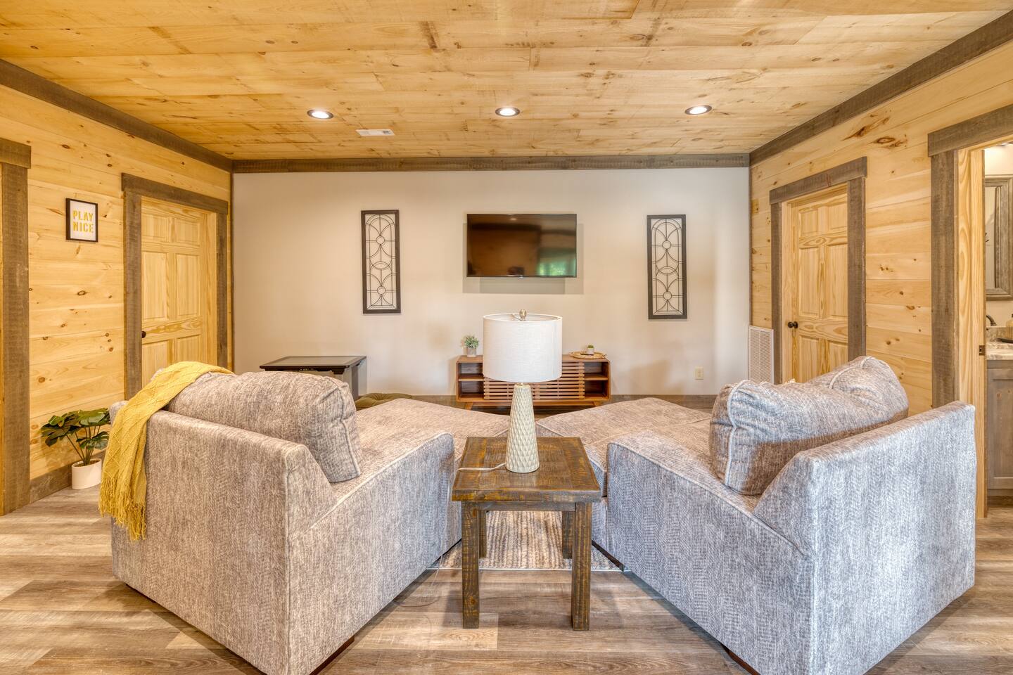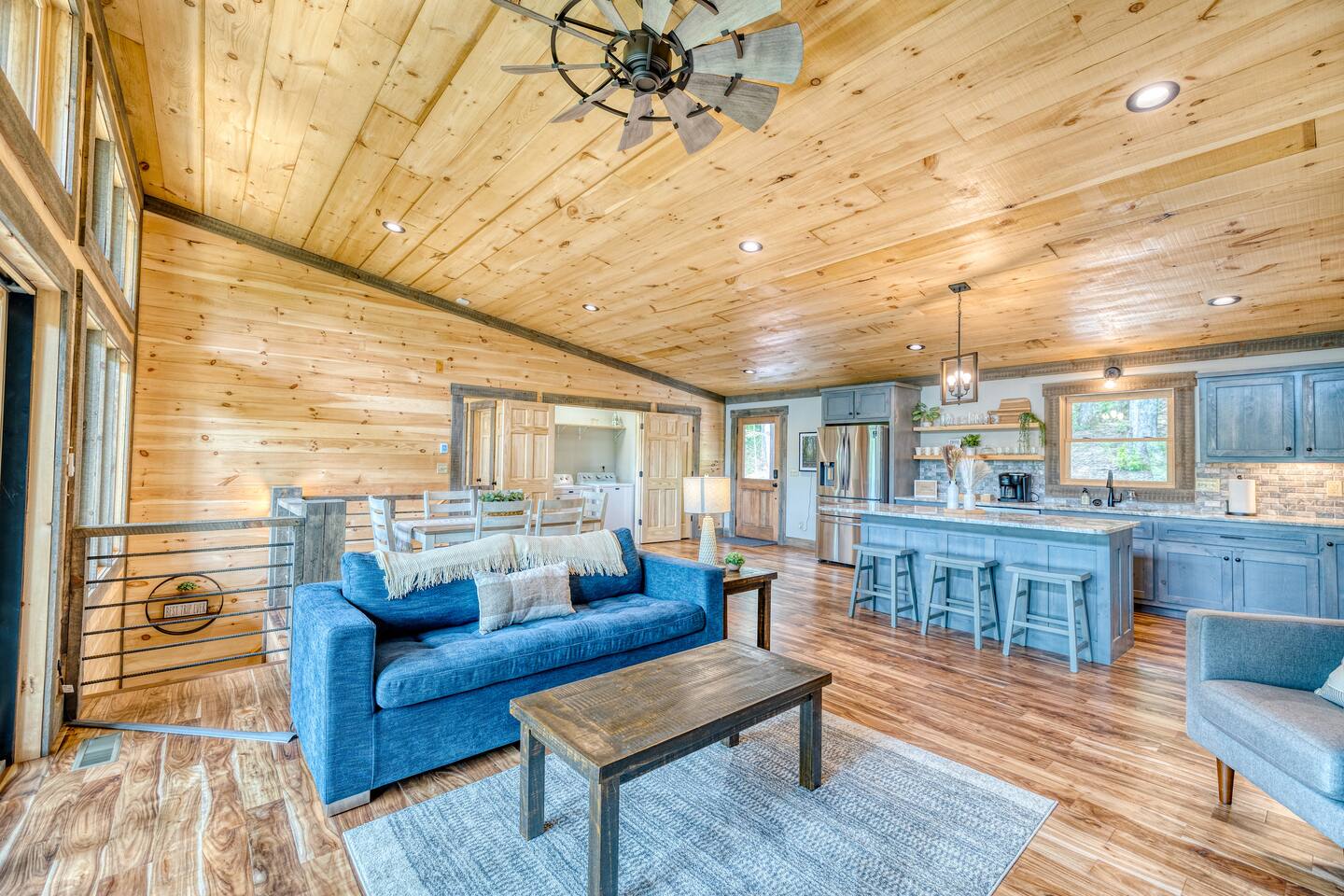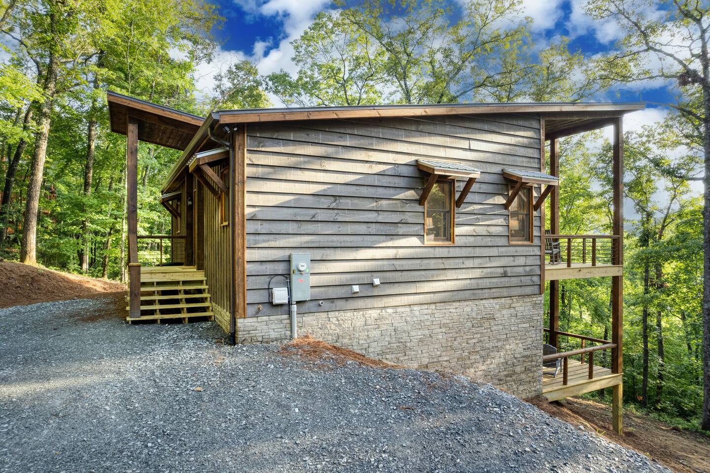KEY HIGHLIGHTS • 3 Bed/3.5 Bathroom Chalet - Sleeps 8 guests • Forest Views • Keyless Entry • NEW! Level-2 ChargePoint EV charger (50A) on site - perfect for overnight charging. • Recently paved driveway (Nov'25) • Outdoor Hot Tub • Super-fast Wifi (500 mbps) • Gas fire pit (lower deck) • Outdoor wood-burning fireplace (upper deck) • Indoor gas fireplace • Retro-inspired rec room • Infinity Game Table (touch screen w/ Scrabble, Yahtzee, chess, etc. +200 games) • Pong arcade & NBA Jam arcade • Complimentary bathroom amenity kits (soap, shampoo, conditioner, body wash and lotion provided) • Roku Smart TVs (bring your own logins) • Fully-equipped kitchen • Washer / dryer with detergent • Central AC & heat • Outdoor dining & living areas • BBQ grill (gas) • Parking for ~3 vehicles (2 is most comfortable) • Dog Friendly (2 max, 75 lb. limit) • 15 Minutes from Blue Ridge Game Room | Forest & Seasonal Mountain Views | Hot Tub | Smart TVs in Each Bedroom | 2,400 Sq Ft | Pet-Friendly BLUE RIDGE MOUNTAINS LOCATION The Bluff Haus is tucked away in the woods in Mineral Bluff, Georgia – right by the charming town of Blue Ridge and the spectacular Blue Ridge Mountains. Located 90 miles north of Atlanta and an easy drive from Nashville and Charlotte, Blue Ridge is the kind of place that lets you escape from it all. Here in the Appalachian foothills, you can hike, bike, fish and chase waterfalls among lush mountains that take on a blue-ish hue from afar. The Toccoa River is great for kayaking, tubing and canoeing while whitewater rafting adventures abound on the Ocoee River a bit further north. Over at Lake Blue Ridge, pontoon boats and paddle boards are available for lazy days at the lake. And when you want to pick it up a notch, you can zipline among trees or tackle an aerial obstacle course at Blue Ridge Adventure Park. The town of Blue Ridge is an artsy destination with quaint shops, antique stores, art galleries, restaurants and craft breweries. We especially love Bin 322 for tapas and wine, as well as Harvest on Main which sources regional ingredients for its Southern cuisine. Right from town, jump on the historic Blue Ridge Scenic Railway which follows the Toccoa River north to the old copper mining town of McCaysville. Eat and shop along the scenic riverwalk or head to Deep Roots Orchard for picnics, wagon rides and campfire cookouts. FOREST DECKS The backyard is a woodland dream with leafy trees everywhere you turn. Our two covered decks invite you to relax and take in all the Appalachia beauty around you. And no houses are visible from the decks – just the woods await you. The upper deck has an outdoor living room with cushioned furniture, a hanging egg chair and a grand stone fireplace with a smart TV. The deck also offers a BBQ grill and farmhouse table where you can linger over picnic lunches and Southern-style cookouts. Two gray rocking chairs offer an old-school way to marvel at the enchanting view before you. On the lower deck, a roomy hot tub (it seats 6 people) is the ultimate place to unwind after a day of adventuring. You can also kick back among 6 Adirondack chairs as you share stories from your day. And once night falls, hanging string lights cast a soft, magical glow over both decks. Take in a deep breath and let out an “Aaaaah.” This is the good life. Enjoy our fire pit that’s made for campfire stories and gooey s’mores. OPEN LIVING, KITCHEN & DINING AREAS Our open-concept living room, kitchen and dining area evoke a treehouse that’s all grown up. One with knotty pine walls and ceilings plus a window wall with treetop views. The living room opens to the upper deck and is where you’ll want to cozy up among comfy furniture and another beautiful stone fireplace. The contemporary blue couch offers a queen-size pull-out sleeper sofa. The kitchen is our favorite part of the house, complete with blue-gray cabinets, a stone backsplash and marbled granite countertops. An iron chandelier pulls together the lovely farmhouse feel of the entire space. Use the Keurig Duo machine to brew fresh single-serve coffee (8 complimentary K-Cups provided) or brew a whole drip pot for your group. And with stainless steel appliances, a fully-stocked kitchen, and cookware aplenty, you’ll have what you need to make everything from stovetop popcorn to Sunday supper (we even offer a spice rack, kids dish sets, and dishwasher pods). An island offers even more counter space and 3 stools where you can saddle up for a pancake breakfast. And a farmhouse dining table which seats 6 people is just steps away. REC ROOM A rec room on the downstairs floor comes with a lot of fun amenities. A cozy den with oversized arm chairs and ottomans is accompanied by a wet bar, video games and digital board games. A retro striped wallpaper mural on one wall lends a ‘70s vibe to the entire room. And the games are equally throwback. A Pong game table has eight classic Atari video games – from the landmark Pong to Tempest and Super Breakout – that up to 4 people can play. With our Infinity Game Table, you can play digital versions of your favorite board games: Monopoly, Scrabble, Yahtzee, Candy Land, Battleship, Chutes and Ladders, chess, checkers and over 200 more. When the time comes for a screen break, sliding glass doors open to the fresh air of the lower deck where you can de-stress in the hot tub. 3 BEDROOMS Our three bedrooms are peaceful retreats with large picture windows and forest views. All 3 rooms offer glass doors that open to the decks. You’ll find rocking or Adirondack chairs outside your room which are great for morning coffee or a nightcap before bed. White-washed and reclaimed wood furniture is joined by country bedding in soothing hues of white, gray and blue. There are also Roku smart TVs in every room (bring your own logins). The bunk bed room also includes an NBA Jam arcade. Bedroom 1 – King bed (master) upstairs, en suite bathroom Bedroo