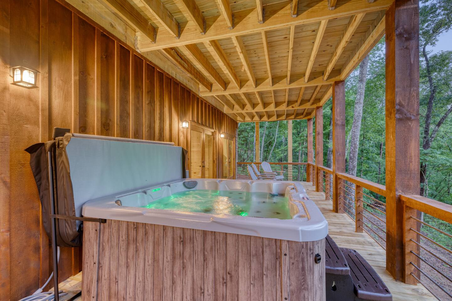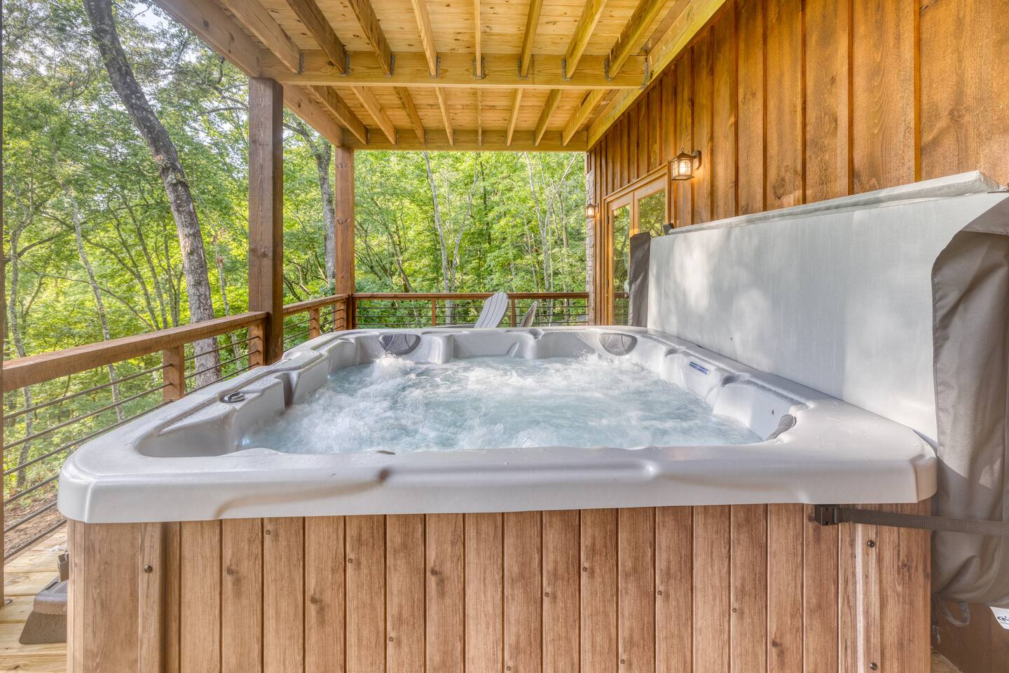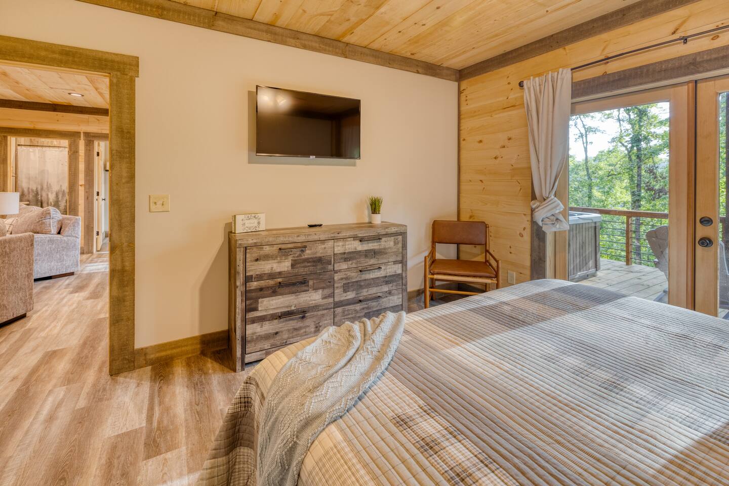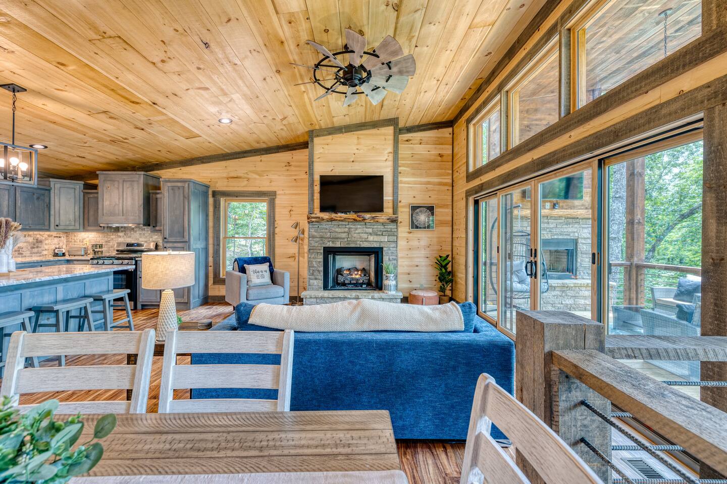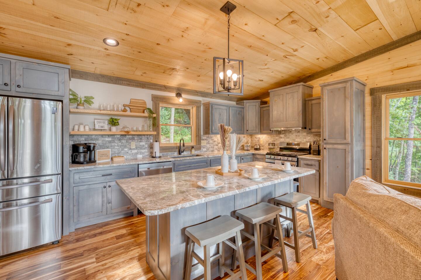 KEY HIGHLIGHTS • 3 Bed/3.5 Bathroom Chalet - Sleeps 8 guests • Forest Views • Keyless Entry • NEW! Level-2 ChargePoint EV charger (50A) on site - perfect for overnight charging. • Recently paved driveway (Nov'25) • Outdoor Hot Tub • Super-fast Wifi (500 mbps) • Gas fire pit (lower deck) • Outdoor wood-burning fireplace (upper deck) • Indoor gas fireplace • Retro-inspired rec room • Infinity Game Table (touch screen w/ Scrabble, Yahtzee, chess, etc. +200 games) • Pong arcade & NBA Jam arcade • Complimentary bathroom amenity kits (soap, shampoo, conditioner, body wash and lotion provided) • Roku Smart TVs (bring your own logins) • Fully-equipped kitchen • Washer / dryer with detergent • Central AC & heat • Outdoor dining & living areas • BBQ grill (gas) • Parking for ~3 vehicles (2 is most comfortable) • Dog Friendly (2 max, 75 lb. limit) • 15 Minutes from Blue Ridge Game Room | Forest & Seasonal Mountain Views | Hot Tub | Smart TVs in Each Bedroom | 2,400 Sq Ft | Pet-Friendly BLUE RIDGE MOUNTAINS LOCATION The Bluff Haus is tucked away in the woods in Mineral Bluff, Georgia – right by the charming town of Blue Ridge and the spectacular Blue Ridge Mountains. Located 90 miles north of Atlanta and an easy drive from Nashville and Charlotte, Blue Ridge is the kind of place that lets you escape from it all. Here in the Appalachian foothills, you can hike, bike, fish and chase waterfalls among lush mountains that take on a blue-ish hue from afar. The Toccoa River is great for kayaking, tubing and canoeing while whitewater rafting adventures abound on the Ocoee River a bit further north. Over at Lake Blue Ridge, pontoon boats and paddle boards are available for lazy days at the lake. And when you want to pick it up a notch, you can zipline among trees or tackle an aerial obstacle course at Blue Ridge Adventure Park. The town of Blue Ridge is an artsy destination with quaint shops, antique stores, art galleries, restaurants and craft breweries. We especially love Bin 322 for tapas and wine, as well as Harvest on Main which sources regional ingredients for its Southern cuisine. Right from town, jump on the historic Blue Ridge Scenic Railway which follows the Toccoa River north to the old copper mining town of McCaysville. Eat and shop along the scenic riverwalk or head to Deep Roots Orchard for picnics, wagon rides and campfire cookouts. FOREST DECKS The backyard is a woodland dream with leafy trees everywhere you turn. Our two covered decks invite you to relax and take in all the Appalachia beauty around you. And no houses are visible from the decks – just the woods await you. The upper deck has an outdoor living room with cushioned furniture, a hanging egg chair and a grand stone fireplace with a smart TV. The deck also offers a BBQ grill and farmhouse table where you can linger over picnic lunches and Southern-style cookouts. Two gray rocking chairs offer an old-school way to marvel at the enchanting view before you. On the lower deck, a roomy hot tub (it seats 6 people) is the ultimate place to unwind after a day of adventuring. You can also kick back among 6 Adirondack chairs as you share stories from your day. And once night falls, hanging string lights cast a soft, magical glow over both decks. Take in a deep breath and let out an “Aaaaah.” This is the good life. Enjoy our fire pit that’s made for campfire stories and gooey s’mores. OPEN LIVING, KITCHEN & DINING AREAS Our open-concept living room, kitchen and dining area evoke a treehouse that’s all grown up. One with knotty pine walls and ceilings plus a window wall with treetop views. The living room opens to the upper deck and is where you’ll want to cozy up among comfy furniture and another beautiful stone fireplace. The contemporary blue couch offers a queen-size pull-out sleeper sofa. The kitchen is our favorite part of the house, complete with blue-gray cabinets, a stone backsplash and marbled granite countertops. An iron chandelier pulls together the lovely farmhouse feel of the entire space. Use the Keurig Duo machine to brew fresh single-serve coffee (8 complimentary K-Cups provided) or brew a whole drip pot for your group. And with stainless steel appliances, a fully-stocked kitchen, and cookware aplenty, you’ll have what you need to make everything from stovetop popcorn to Sunday supper (we even offer a spice rack, kids dish sets, and dishwasher pods). An island offers even more counter space and 3 stools where you can saddle up for a pancake breakfast. And a farmhouse dining table which seats 6 people is just steps away. REC ROOM A rec room on the downstairs floor comes with a lot of fun amenities. A cozy den with oversized arm chairs and ottomans is accompanied by a wet bar, video games and digital board games. A retro striped wallpaper mural on one wall lends a ‘70s vibe to the entire room. And the games are equally throwback. A Pong game table has eight classic Atari video games – from the landmark Pong to Tempest and Super Breakout – that up to 4 people can play. With our Infinity Game Table, you can play digital versions of your favorite board games: Monopoly, Scrabble, Yahtzee, Candy Land, Battleship, Chutes and Ladders, chess, checkers and over 200 more. When the time comes for a screen break, sliding glass doors open to the fresh air of the lower deck where you can de-stress in the hot tub. 3 BEDROOMS Our three bedrooms are peaceful retreats with large picture windows and forest views. All 3 rooms offer glass doors that open to the decks. You’ll find rocking or Adirondack chairs outside your room which are great for morning coffee or a nightcap before bed. White-washed and reclaimed wood furniture is joined by country bedding in soothing hues of white, gray and blue. There are also Roku smart TVs in every room (bring your own logins). The bunk bed room also includes an NBA Jam arcade. Bedroom 1 – King bed (master) upstairs, en suite bathroom Bedroo