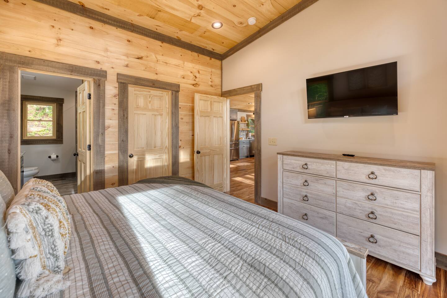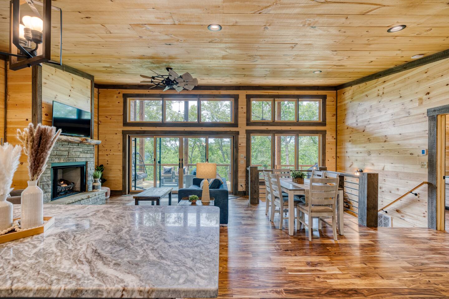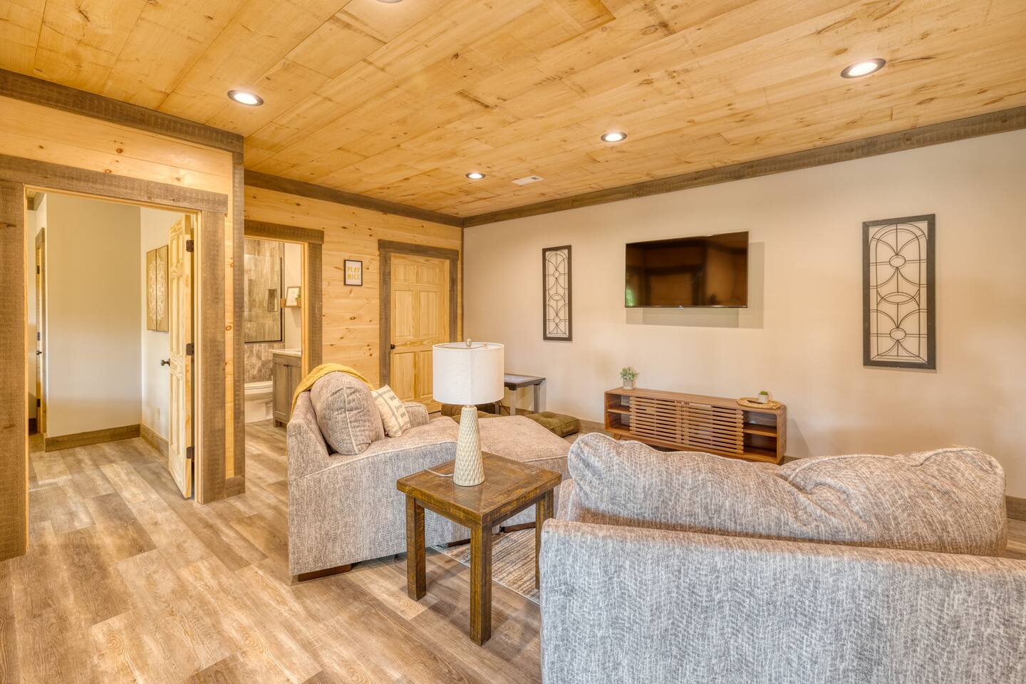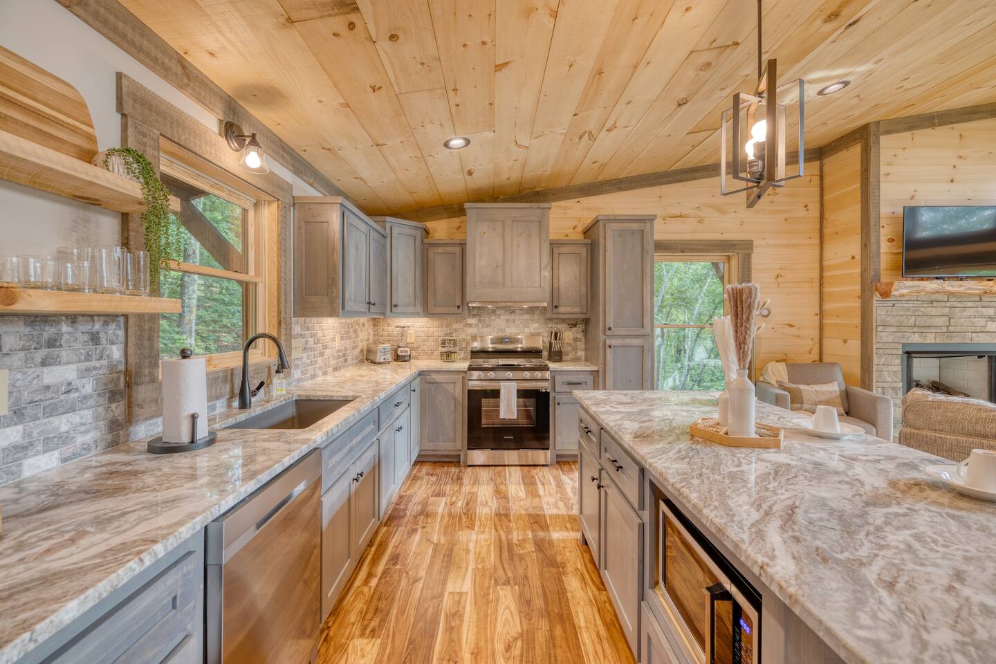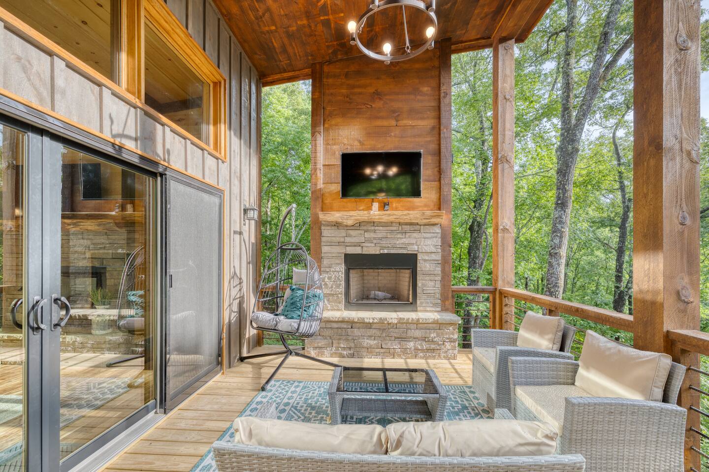 KEY HIGHLIGHTS • 3 Bed/3.5 Bathroom Chalet - Sleeps 8 guests • Forest Views • Keyless Entry • NEW! Level-2 ChargePoint EV charger (50A) on site - perfect for overnight charging. • Recently paved driveway (Nov'25) • Outdoor Hot Tub • Super-fast Wifi (500 mbps) • Gas fire pit (lower deck) • Outdoor wood-burning fireplace (upper deck) • Indoor gas fireplace • Retro-inspired rec room • Infinity Game Table (touch screen w/ Scrabble, Yahtzee, chess, etc. +200 games) • Pong arcade & NBA Jam arcade • Complimentary bathroom amenity kits (soap, shampoo, conditioner, body wash and lotion provided) • Roku Smart TVs (bring your own logins) • Fully-equipped kitchen • Washer / dryer with detergent • Central AC & heat • Outdoor dining & living areas • BBQ grill (gas) • Parking for ~3 vehicles (2 is most comfortable) • Dog Friendly (2 max, 75 lb. limit) • 15 Minutes from Blue Ridge Game Room | Forest & Seasonal Mountain Views | Hot Tub | Smart TVs in Each Bedroom | 2,400 Sq Ft | Pet-Friendly BLUE RIDGE MOUNTAINS LOCATION The Bluff Haus is tucked away in the woods in Mineral Bluff, Georgia – right by the charming town of Blue Ridge and the spectacular Blue Ridge Mountains. Located 90 miles north of Atlanta and an easy drive from Nashville and Charlotte, Blue Ridge is the kind of place that lets you escape from it all. Here in the Appalachian foothills, you can hike, bike, fish and chase waterfalls among lush mountains that take on a blue-ish hue from afar. The Toccoa River is great for kayaking, tubing and canoeing while whitewater rafting adventures abound on the Ocoee River a bit further north. Over at Lake Blue Ridge, pontoon boats and paddle boards are available for lazy days at the lake. And when you want to pick it up a notch, you can zipline among trees or tackle an aerial obstacle course at Blue Ridge Adventure Park. The town of Blue Ridge is an artsy destination with quaint shops, antique stores, art galleries, restaurants and craft breweries. We especially love Bin 322 for tapas and wine, as well as Harvest on Main which sources regional ingredients for its Southern cuisine. Right from town, jump on the historic Blue Ridge Scenic Railway which follows the Toccoa River north to the old copper mining town of McCaysville. Eat and shop along the scenic riverwalk or head to Deep Roots Orchard for picnics, wagon rides and campfire cookouts. FOREST DECKS The backyard is a woodland dream with leafy trees everywhere you turn. Our two covered decks invite you to relax and take in all the Appalachia beauty around you. And no houses are visible from the decks – just the woods await you. The upper deck has an outdoor living room with cushioned furniture, a hanging egg chair and a grand stone fireplace with a smart TV. The deck also offers a BBQ grill and farmhouse table where you can linger over picnic lunches and Southern-style cookouts. Two gray rocking chairs offer an old-school way to marvel at the enchanting view before you. On the lower deck, a roomy hot tub (it seats 6 people) is the ultimate place to unwind after a day of adventuring. You can also kick back among 6 Adirondack chairs as you share stories from your day. And once night falls, hanging string lights cast a soft, magical glow over both decks. Take in a deep breath and let out an “Aaaaah.” This is the good life. Enjoy our fire pit that’s made for campfire stories and gooey s’mores. OPEN LIVING, KITCHEN & DINING AREAS Our open-concept living room, kitchen and dining area evoke a treehouse that’s all grown up. One with knotty pine walls and ceilings plus a window wall with treetop views. The living room opens to the upper deck and is where you’ll want to cozy up among comfy furniture and another beautiful stone fireplace. The contemporary blue couch offers a queen-size pull-out sleeper sofa. The kitchen is our favorite part of the house, complete with blue-gray cabinets, a stone backsplash and marbled granite countertops. An iron chandelier pulls together the lovely farmhouse feel of the entire space. Use the Keurig Duo machine to brew fresh single-serve coffee (8 complimentary K-Cups provided) or brew a whole drip pot for your group. And with stainless steel appliances, a fully-stocked kitchen, and cookware aplenty, you’ll have what you need to make everything from stovetop popcorn to Sunday supper (we even offer a spice rack, kids dish sets, and dishwasher pods). An island offers even more counter space and 3 stools where you can saddle up for a pancake breakfast. And a farmhouse dining table which seats 6 people is just steps away. REC ROOM A rec room on the downstairs floor comes with a lot of fun amenities. A cozy den with oversized arm chairs and ottomans is accompanied by a wet bar, video games and digital board games. A retro striped wallpaper mural on one wall lends a ‘70s vibe to the entire room. And the games are equally throwback. A Pong game table has eight classic Atari video games – from the landmark Pong to Tempest and Super Breakout – that up to 4 people can play. With our Infinity Game Table, you can play digital versions of your favorite board games: Monopoly, Scrabble, Yahtzee, Candy Land, Battleship, Chutes and Ladders, chess, checkers and over 200 more. When the time comes for a screen break, sliding glass doors open to the fresh air of the lower deck where you can de-stress in the hot tub. 3 BEDROOMS Our three bedrooms are peaceful retreats with large picture windows and forest views. All 3 rooms offer glass doors that open to the decks. You’ll find rocking or Adirondack chairs outside your room which are great for morning coffee or a nightcap before bed. White-washed and reclaimed wood furniture is joined by country bedding in soothing hues of white, gray and blue. There are also Roku smart TVs in every room (bring your own logins). The bunk bed room also includes an NBA Jam arcade. Bedroom 1 – King bed (master) upstairs, en suite bathroom Bedroo