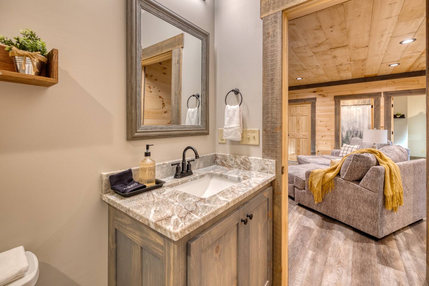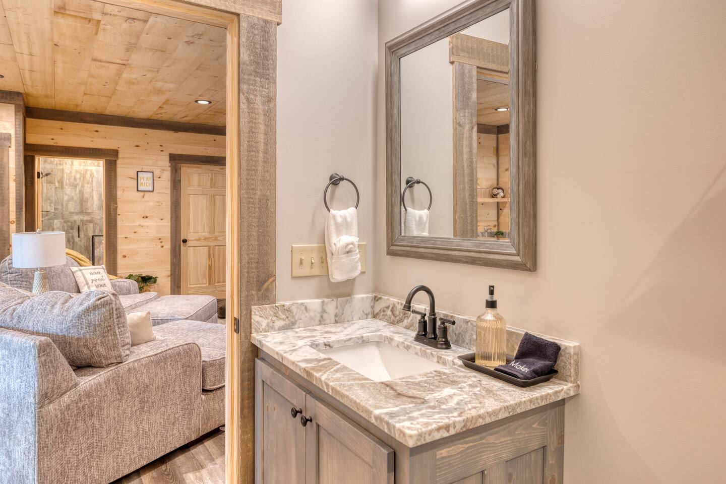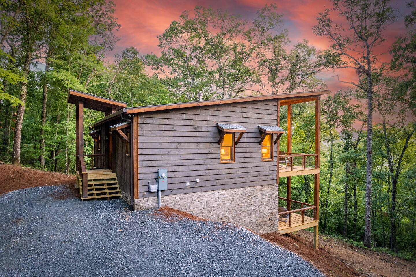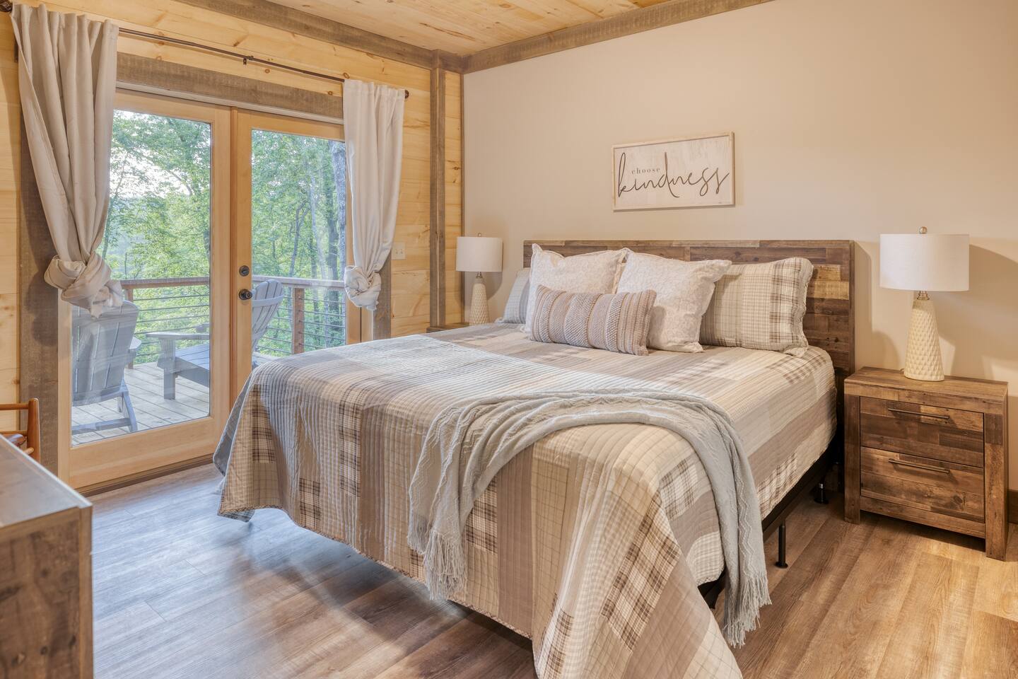 KEY HIGHLIGHTS • 3 Bed/3.5 Bathroom Chalet - Sleeps 8 guests • Forest Views • Keyless Entry • NEW! Level-2 ChargePoint EV charger (50A) on site - perfect for overnight charging. • Recently paved driveway (Nov'25) • Outdoor Hot Tub • Super-fast Wifi (500 mbps) • Gas fire pit (lower deck) • Outdoor wood-burning fireplace (upper deck) • Indoor gas fireplace • Retro-inspired rec room • Infinity Game Table (touch screen w/ Scrabble, Yahtzee, chess, etc. +200 games) • Pong arcade & NBA Jam arcade • Complimentary bathroom amenity kits (soap, shampoo, conditioner, body wash and lotion provided) • Roku Smart TVs (bring your own logins) • Fully-equipped kitchen • Washer / dryer with detergent • Central AC & heat • Outdoor dining & living areas • BBQ grill (gas) • Parking for ~3 vehicles (2 is most comfortable) • Dog Friendly (2 max, 75 lb. limit) • 15 Minutes from Blue Ridge Game Room | Forest & Seasonal Mountain Views | Hot Tub | Smart TVs in Each Bedroom | 2,400 Sq Ft | Pet-Friendly BLUE RIDGE MOUNTAINS LOCATION The Bluff Haus is tucked away in the woods in Mineral Bluff, Georgia – right by the charming town of Blue Ridge and the spectacular Blue Ridge Mountains. Located 90 miles north of Atlanta and an easy drive from Nashville and Charlotte, Blue Ridge is the kind of place that lets you escape from it all. Here in the Appalachian foothills, you can hike, bike, fish and chase waterfalls among lush mountains that take on a blue-ish hue from afar. The Toccoa River is great for kayaking, tubing and canoeing while whitewater rafting adventures abound on the Ocoee River a bit further north. Over at Lake Blue Ridge, pontoon boats and paddle boards are available for lazy days at the lake. And when you want to pick it up a notch, you can zipline among trees or tackle an aerial obstacle course at Blue Ridge Adventure Park. The town of Blue Ridge is an artsy destination with quaint shops, antique stores, art galleries, restaurants and craft breweries. We especially love Bin 322 for tapas and wine, as well as Harvest on Main which sources regional ingredients for its Southern cuisine. Right from town, jump on the historic Blue Ridge Scenic Railway which follows the Toccoa River north to the old copper mining town of McCaysville. Eat and shop along the scenic riverwalk or head to Deep Roots Orchard for picnics, wagon rides and campfire cookouts. FOREST DECKS The backyard is a woodland dream with leafy trees everywhere you turn. Our two covered decks invite you to relax and take in all the Appalachia beauty around you. And no houses are visible from the decks – just the woods await you. The upper deck has an outdoor living room with cushioned furniture, a hanging egg chair and a grand stone fireplace with a smart TV. The deck also offers a BBQ grill and farmhouse table where you can linger over picnic lunches and Southern-style cookouts. Two gray rocking chairs offer an old-school way to marvel at the enchanting view before you. On the lower deck, a roomy hot tub (it seats 6 people) is the ultimate place to unwind after a day of adventuring. You can also kick back among 6 Adirondack chairs as you share stories from your day. And once night falls, hanging string lights cast a soft, magical glow over both decks. Take in a deep breath and let out an “Aaaaah.” This is the good life. Enjoy our fire pit that’s made for campfire stories and gooey s’mores. OPEN LIVING, KITCHEN & DINING AREAS Our open-concept living room, kitchen and dining area evoke a treehouse that’s all grown up. One with knotty pine walls and ceilings plus a window wall with treetop views. The living room opens to the upper deck and is where you’ll want to cozy up among comfy furniture and another beautiful stone fireplace. The contemporary blue couch offers a queen-size pull-out sleeper sofa. The kitchen is our favorite part of the house, complete with blue-gray cabinets, a stone backsplash and marbled granite countertops. An iron chandelier pulls together the lovely farmhouse feel of the entire space. Use the Keurig Duo machine to brew fresh single-serve coffee (8 complimentary K-Cups provided) or brew a whole drip pot for your group. And with stainless steel appliances, a fully-stocked kitchen, and cookware aplenty, you’ll have what you need to make everything from stovetop popcorn to Sunday supper (we even offer a spice rack, kids dish sets, and dishwasher pods). An island offers even more counter space and 3 stools where you can saddle up for a pancake breakfast. And a farmhouse dining table which seats 6 people is just steps away. REC ROOM A rec room on the downstairs floor comes with a lot of fun amenities. A cozy den with oversized arm chairs and ottomans is accompanied by a wet bar, video games and digital board games. A retro striped wallpaper mural on one wall lends a ‘70s vibe to the entire room. And the games are equally throwback. A Pong game table has eight classic Atari video games – from the landmark Pong to Tempest and Super Breakout – that up to 4 people can play. With our Infinity Game Table, you can play digital versions of your favorite board games: Monopoly, Scrabble, Yahtzee, Candy Land, Battleship, Chutes and Ladders, chess, checkers and over 200 more. When the time comes for a screen break, sliding glass doors open to the fresh air of the lower deck where you can de-stress in the hot tub. 3 BEDROOMS Our three bedrooms are peaceful retreats with large picture windows and forest views. All 3 rooms offer glass doors that open to the decks. You’ll find rocking or Adirondack chairs outside your room which are great for morning coffee or a nightcap before bed. White-washed and reclaimed wood furniture is joined by country bedding in soothing hues of white, gray and blue. There are also Roku smart TVs in every room (bring your own logins). The bunk bed room also includes an NBA Jam arcade. Bedroom 1 – King bed (master) upstairs, en suite bathroom Bedroo
