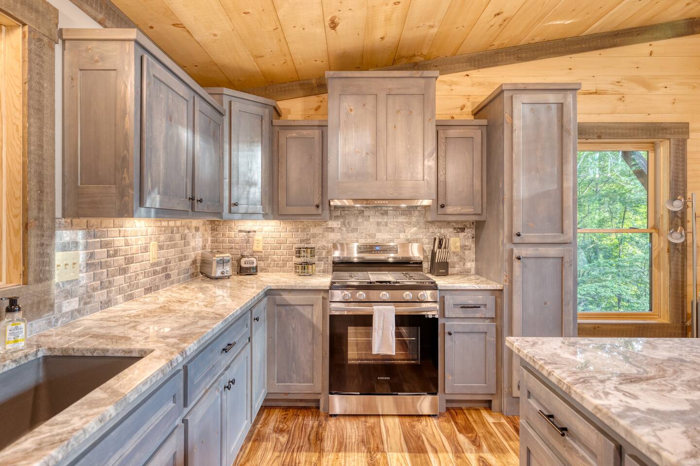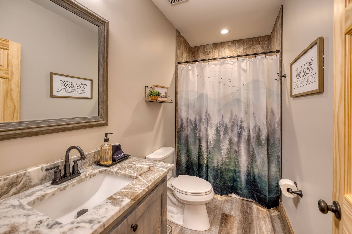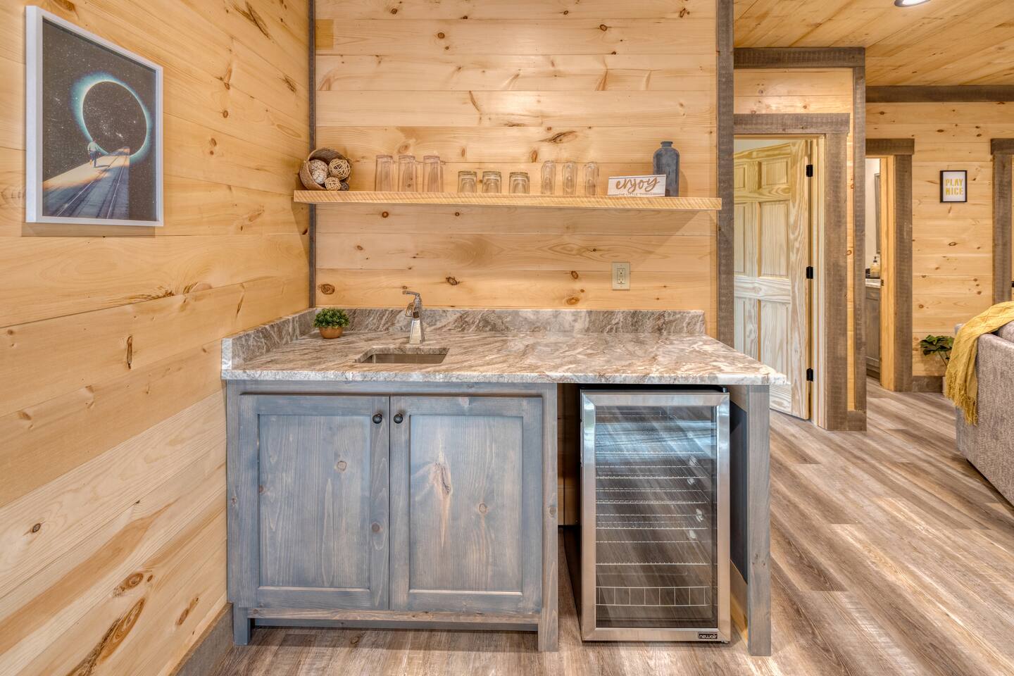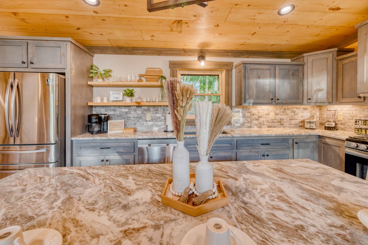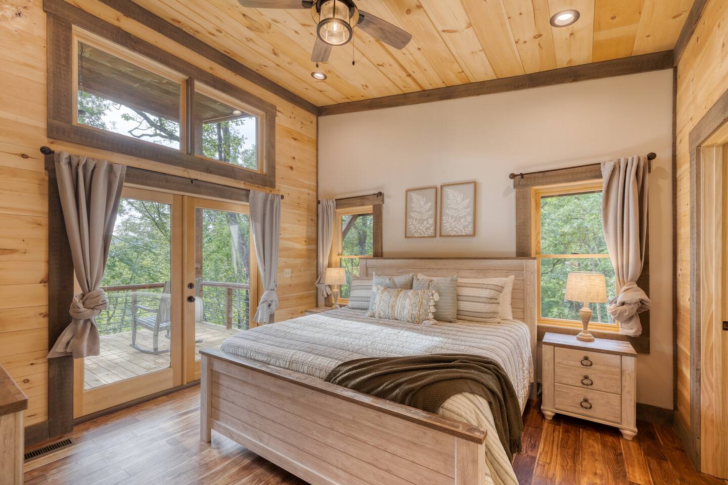 KEY HIGHLIGHTS • 3 Bed/3.5 Bathroom Chalet - Sleeps 8 guests • Forest Views • Keyless Entry • NEW! Level-2 ChargePoint EV charger (50A) on site - perfect for overnight charging. • Recently paved driveway (Nov'25) • Outdoor Hot Tub • Super-fast Wifi (500 mbps) • Gas fire pit (lower deck) • Outdoor wood-burning fireplace (upper deck) • Indoor gas fireplace • Retro-inspired rec room • Infinity Game Table (touch screen w/ Scrabble, Yahtzee, chess, etc. +200 games) • Pong arcade & NBA Jam arcade • Complimentary bathroom amenity kits (soap, shampoo, conditioner, body wash and lotion provided) • Roku Smart TVs (bring your own logins) • Fully-equipped kitchen • Washer / dryer with detergent • Central AC & heat • Outdoor dining & living areas • BBQ grill (gas) • Parking for ~3 vehicles (2 is most comfortable) • Dog Friendly (2 max, 75 lb. limit) • 15 Minutes from Blue Ridge Game Room | Forest & Seasonal Mountain Views | Hot Tub | Smart TVs in Each Bedroom | 2,400 Sq Ft | Pet-Friendly BLUE RIDGE MOUNTAINS LOCATION The Bluff Haus is tucked away in the woods in Mineral Bluff, Georgia – right by the charming town of Blue Ridge and the spectacular Blue Ridge Mountains. Located 90 miles north of Atlanta and an easy drive from Nashville and Charlotte, Blue Ridge is the kind of place that lets you escape from it all. Here in the Appalachian foothills, you can hike, bike, fish and chase waterfalls among lush mountains that take on a blue-ish hue from afar. The Toccoa River is great for kayaking, tubing and canoeing while whitewater rafting adventures abound on the Ocoee River a bit further north. Over at Lake Blue Ridge, pontoon boats and paddle boards are available for lazy days at the lake. And when you want to pick it up a notch, you can zipline among trees or tackle an aerial obstacle course at Blue Ridge Adventure Park. The town of Blue Ridge is an artsy destination with quaint shops, antique stores, art galleries, restaurants and craft breweries. We especially love Bin 322 for tapas and wine, as well as Harvest on Main which sources regional ingredients for its Southern cuisine. Right from town, jump on the historic Blue Ridge Scenic Railway which follows the Toccoa River north to the old copper mining town of McCaysville. Eat and shop along the scenic riverwalk or head to Deep Roots Orchard for picnics, wagon rides and campfire cookouts. FOREST DECKS The backyard is a woodland dream with leafy trees everywhere you turn. Our two covered decks invite you to relax and take in all the Appalachia beauty around you. And no houses are visible from the decks – just the woods await you. The upper deck has an outdoor living room with cushioned furniture, a hanging egg chair and a grand stone fireplace with a smart TV. The deck also offers a BBQ grill and farmhouse table where you can linger over picnic lunches and Southern-style cookouts. Two gray rocking chairs offer an old-school way to marvel at the enchanting view before you. On the lower deck, a roomy hot tub (it seats 6 people) is the ultimate place to unwind after a day of adventuring. You can also kick back among 6 Adirondack chairs as you share stories from your day. And once night falls, hanging string lights cast a soft, magical glow over both decks. Take in a deep breath and let out an “Aaaaah.” This is the good life. Enjoy our fire pit that’s made for campfire stories and gooey s’mores. OPEN LIVING, KITCHEN & DINING AREAS Our open-concept living room, kitchen and dining area evoke a treehouse that’s all grown up. One with knotty pine walls and ceilings plus a window wall with treetop views. The living room opens to the upper deck and is where you’ll want to cozy up among comfy furniture and another beautiful stone fireplace. The contemporary blue couch offers a queen-size pull-out sleeper sofa. The kitchen is our favorite part of the house, complete with blue-gray cabinets, a stone backsplash and marbled granite countertops. An iron chandelier pulls together the lovely farmhouse feel of the entire space. Use the Keurig Duo machine to brew fresh single-serve coffee (8 complimentary K-Cups provided) or brew a whole drip pot for your group. And with stainless steel appliances, a fully-stocked kitchen, and cookware aplenty, you’ll have what you need to make everything from stovetop popcorn to Sunday supper (we even offer a spice rack, kids dish sets, and dishwasher pods). An island offers even more counter space and 3 stools where you can saddle up for a pancake breakfast. And a farmhouse dining table which seats 6 people is just steps away. REC ROOM A rec room on the downstairs floor comes with a lot of fun amenities. A cozy den with oversized arm chairs and ottomans is accompanied by a wet bar, video games and digital board games. A retro striped wallpaper mural on one wall lends a ‘70s vibe to the entire room. And the games are equally throwback. A Pong game table has eight classic Atari video games – from the landmark Pong to Tempest and Super Breakout – that up to 4 people can play. With our Infinity Game Table, you can play digital versions of your favorite board games: Monopoly, Scrabble, Yahtzee, Candy Land, Battleship, Chutes and Ladders, chess, checkers and over 200 more. When the time comes for a screen break, sliding glass doors open to the fresh air of the lower deck where you can de-stress in the hot tub. 3 BEDROOMS Our three bedrooms are peaceful retreats with large picture windows and forest views. All 3 rooms offer glass doors that open to the decks. You’ll find rocking or Adirondack chairs outside your room which are great for morning coffee or a nightcap before bed. White-washed and reclaimed wood furniture is joined by country bedding in soothing hues of white, gray and blue. There are also Roku smart TVs in every room (bring your own logins). The bunk bed room also includes an NBA Jam arcade. Bedroom 1 – King bed (master) upstairs, en suite bathroom Bedroo