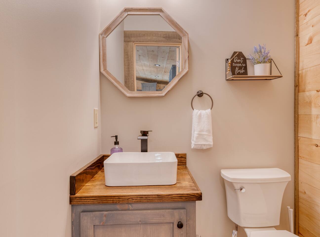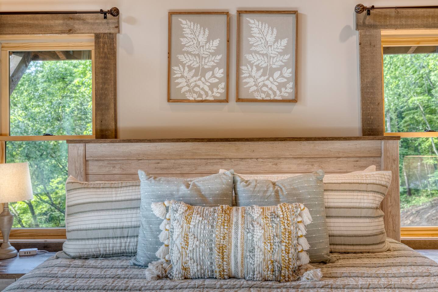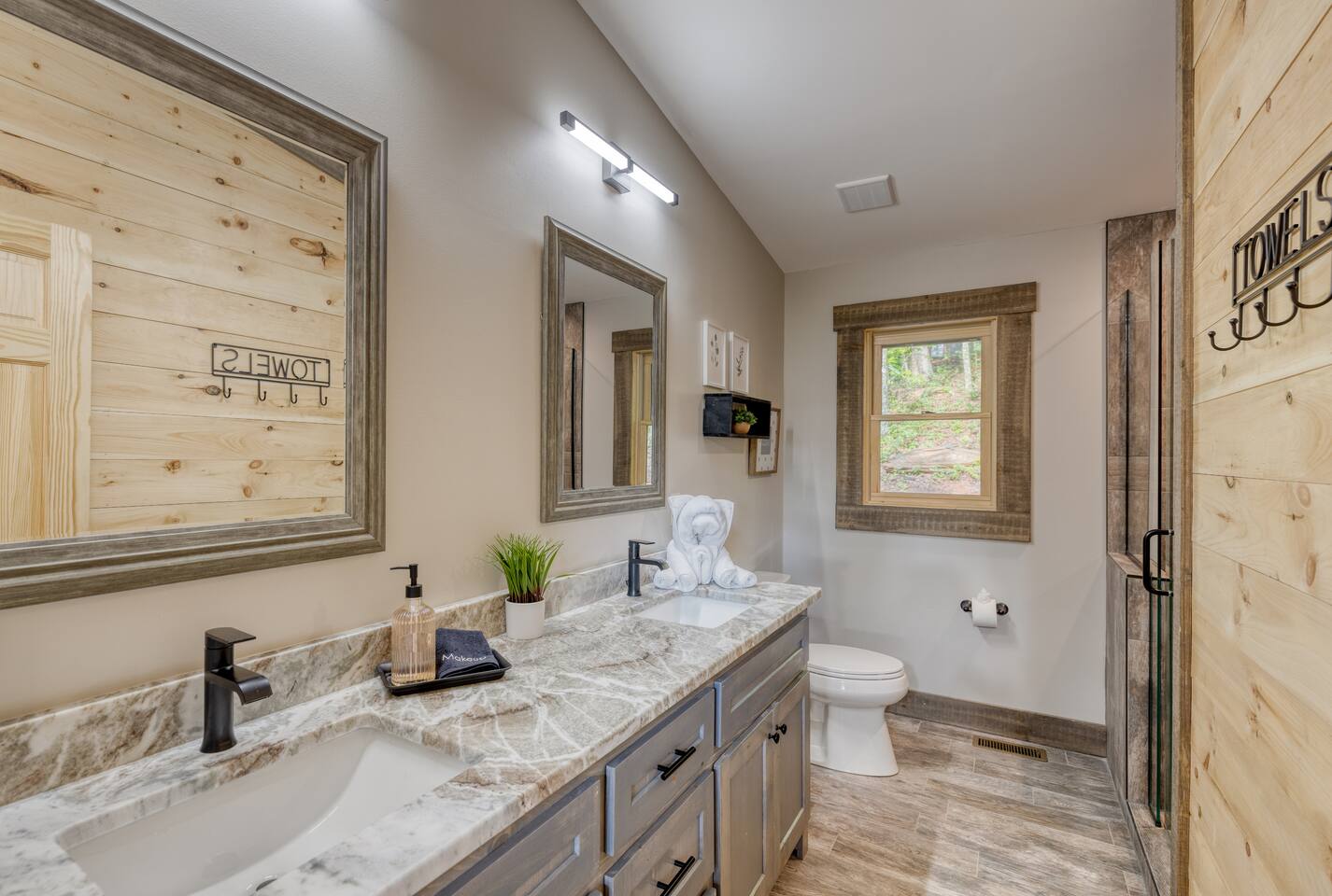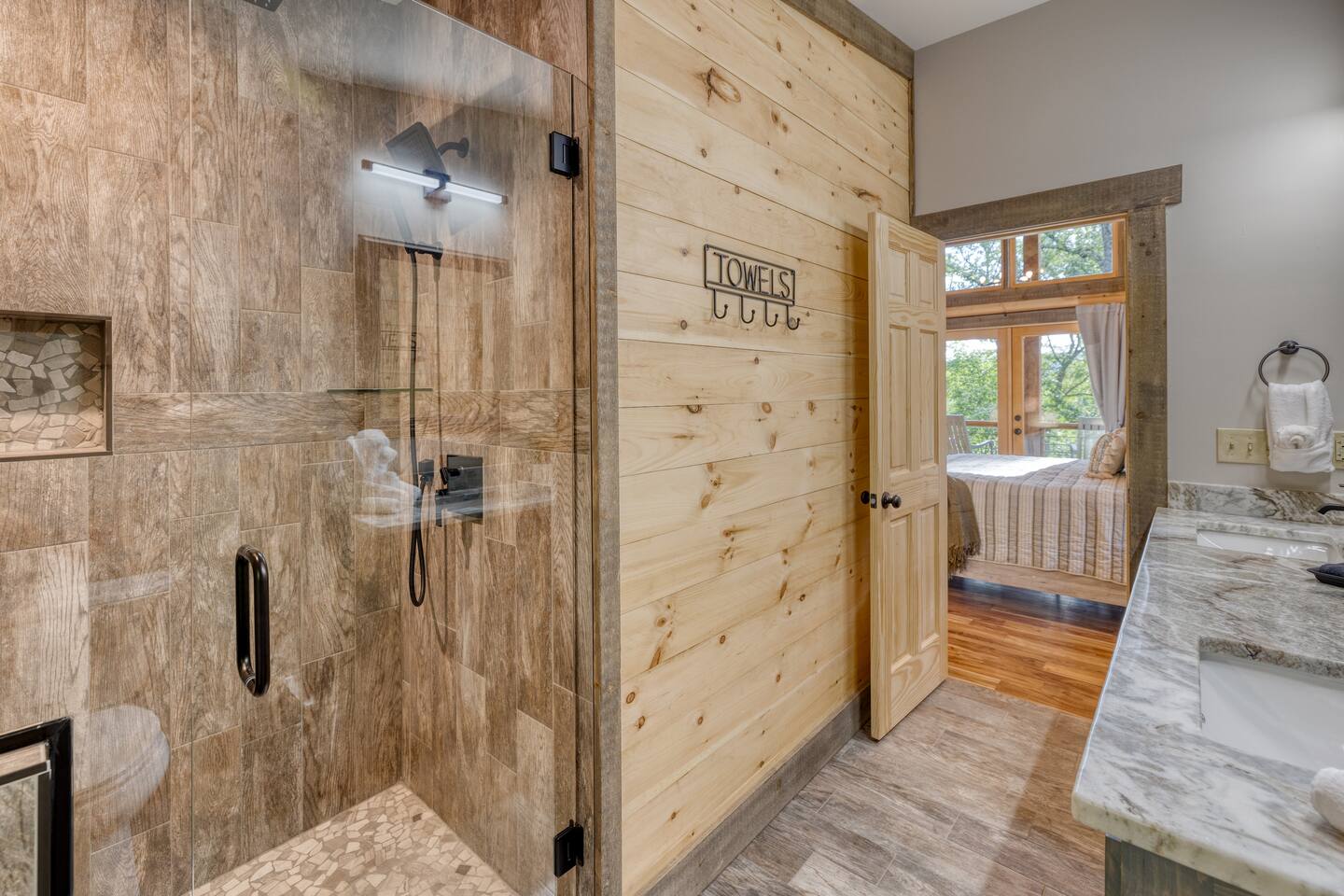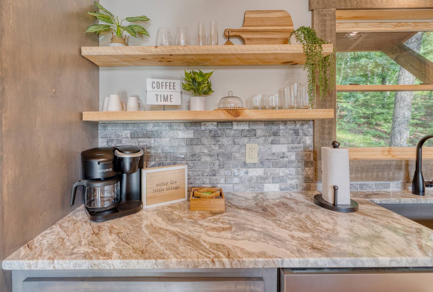 KEY HIGHLIGHTS • 3 Bed/3.5 Bathroom Chalet - Sleeps 8 guests • Forest Views • Keyless Entry • NEW! Level-2 ChargePoint EV charger (50A) on site - perfect for overnight charging. • Recently paved driveway (Nov'25) • Outdoor Hot Tub • Super-fast Wifi (500 mbps) • Gas fire pit (lower deck) • Outdoor wood-burning fireplace (upper deck) • Indoor gas fireplace • Retro-inspired rec room • Infinity Game Table (touch screen w/ Scrabble, Yahtzee, chess, etc. +200 games) • Pong arcade & NBA Jam arcade • Complimentary bathroom amenity kits (soap, shampoo, conditioner, body wash and lotion provided) • Roku Smart TVs (bring your own logins) • Fully-equipped kitchen • Washer / dryer with detergent • Central AC & heat • Outdoor dining & living areas • BBQ grill (gas) • Parking for ~3 vehicles (2 is most comfortable) • Dog Friendly (2 max, 75 lb. limit) • 15 Minutes from Blue Ridge Game Room | Forest & Seasonal Mountain Views | Hot Tub | Smart TVs in Each Bedroom | 2,400 Sq Ft | Pet-Friendly BLUE RIDGE MOUNTAINS LOCATION The Bluff Haus is tucked away in the woods in Mineral Bluff, Georgia – right by the charming town of Blue Ridge and the spectacular Blue Ridge Mountains. Located 90 miles north of Atlanta and an easy drive from Nashville and Charlotte, Blue Ridge is the kind of place that lets you escape from it all. Here in the Appalachian foothills, you can hike, bike, fish and chase waterfalls among lush mountains that take on a blue-ish hue from afar. The Toccoa River is great for kayaking, tubing and canoeing while whitewater rafting adventures abound on the Ocoee River a bit further north. Over at Lake Blue Ridge, pontoon boats and paddle boards are available for lazy days at the lake. And when you want to pick it up a notch, you can zipline among trees or tackle an aerial obstacle course at Blue Ridge Adventure Park. The town of Blue Ridge is an artsy destination with quaint shops, antique stores, art galleries, restaurants and craft breweries. We especially love Bin 322 for tapas and wine, as well as Harvest on Main which sources regional ingredients for its Southern cuisine. Right from town, jump on the historic Blue Ridge Scenic Railway which follows the Toccoa River north to the old copper mining town of McCaysville. Eat and shop along the scenic riverwalk or head to Deep Roots Orchard for picnics, wagon rides and campfire cookouts. FOREST DECKS The backyard is a woodland dream with leafy trees everywhere you turn. Our two covered decks invite you to relax and take in all the Appalachia beauty around you. And no houses are visible from the decks – just the woods await you. The upper deck has an outdoor living room with cushioned furniture, a hanging egg chair and a grand stone fireplace with a smart TV. The deck also offers a BBQ grill and farmhouse table where you can linger over picnic lunches and Southern-style cookouts. Two gray rocking chairs offer an old-school way to marvel at the enchanting view before you. On the lower deck, a roomy hot tub (it seats 6 people) is the ultimate place to unwind after a day of adventuring. You can also kick back among 6 Adirondack chairs as you share stories from your day. And once night falls, hanging string lights cast a soft, magical glow over both decks. Take in a deep breath and let out an “Aaaaah.” This is the good life. Enjoy our fire pit that’s made for campfire stories and gooey s’mores. OPEN LIVING, KITCHEN & DINING AREAS Our open-concept living room, kitchen and dining area evoke a treehouse that’s all grown up. One with knotty pine walls and ceilings plus a window wall with treetop views. The living room opens to the upper deck and is where you’ll want to cozy up among comfy furniture and another beautiful stone fireplace. The contemporary blue couch offers a queen-size pull-out sleeper sofa. The kitchen is our favorite part of the house, complete with blue-gray cabinets, a stone backsplash and marbled granite countertops. An iron chandelier pulls together the lovely farmhouse feel of the entire space. Use the Keurig Duo machine to brew fresh single-serve coffee (8 complimentary K-Cups provided) or brew a whole drip pot for your group. And with stainless steel appliances, a fully-stocked kitchen, and cookware aplenty, you’ll have what you need to make everything from stovetop popcorn to Sunday supper (we even offer a spice rack, kids dish sets, and dishwasher pods). An island offers even more counter space and 3 stools where you can saddle up for a pancake breakfast. And a farmhouse dining table which seats 6 people is just steps away. REC ROOM A rec room on the downstairs floor comes with a lot of fun amenities. A cozy den with oversized arm chairs and ottomans is accompanied by a wet bar, video games and digital board games. A retro striped wallpaper mural on one wall lends a ‘70s vibe to the entire room. And the games are equally throwback. A Pong game table has eight classic Atari video games – from the landmark Pong to Tempest and Super Breakout – that up to 4 people can play. With our Infinity Game Table, you can play digital versions of your favorite board games: Monopoly, Scrabble, Yahtzee, Candy Land, Battleship, Chutes and Ladders, chess, checkers and over 200 more. When the time comes for a screen break, sliding glass doors open to the fresh air of the lower deck where you can de-stress in the hot tub. 3 BEDROOMS Our three bedrooms are peaceful retreats with large picture windows and forest views. All 3 rooms offer glass doors that open to the decks. You’ll find rocking or Adirondack chairs outside your room which are great for morning coffee or a nightcap before bed. White-washed and reclaimed wood furniture is joined by country bedding in soothing hues of white, gray and blue. There are also Roku smart TVs in every room (bring your own logins). The bunk bed room also includes an NBA Jam arcade. Bedroom 1 – King bed (master) upstairs, en suite bathroom Bedroo