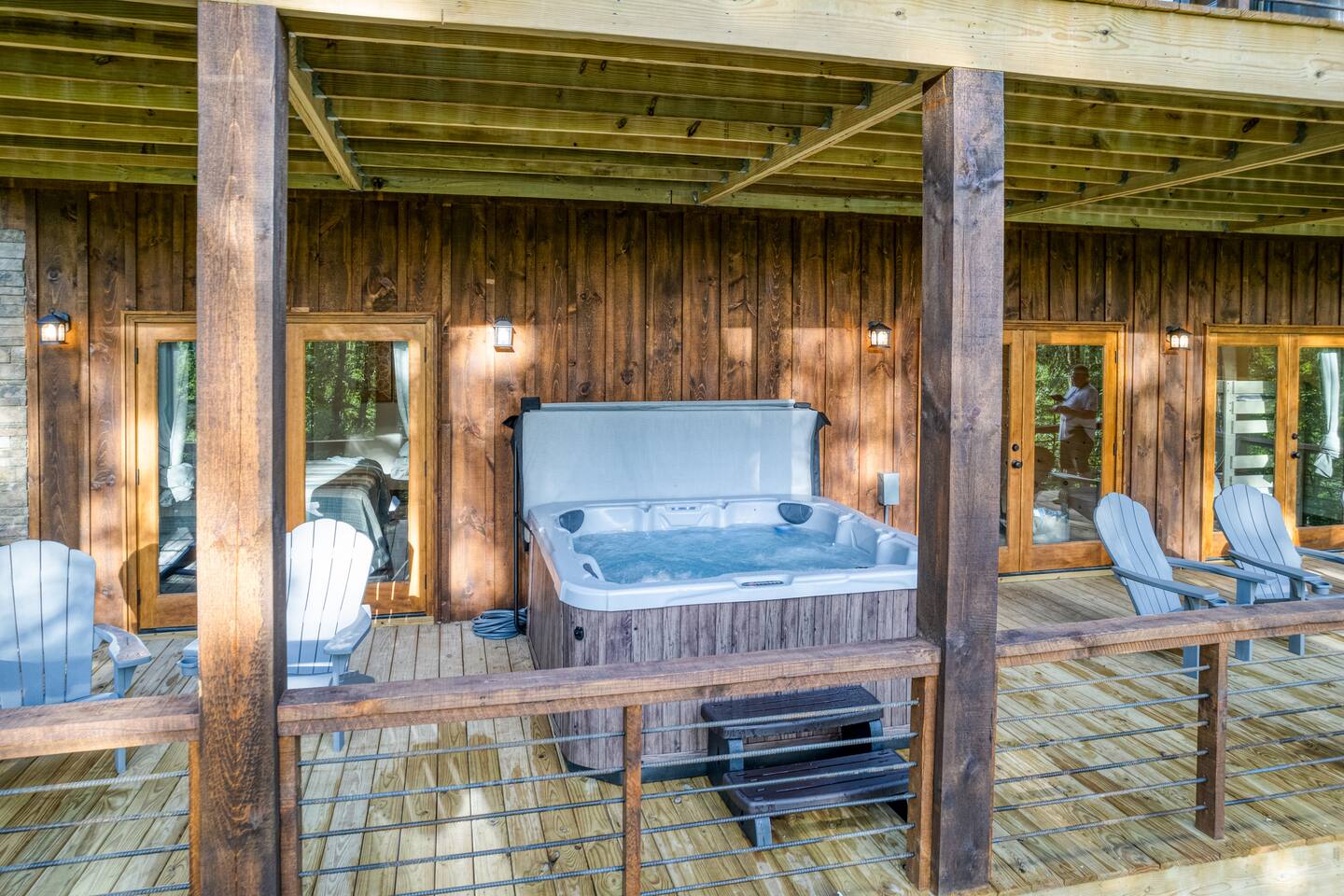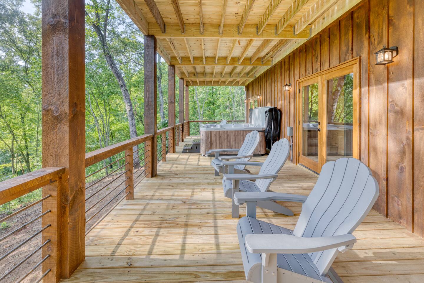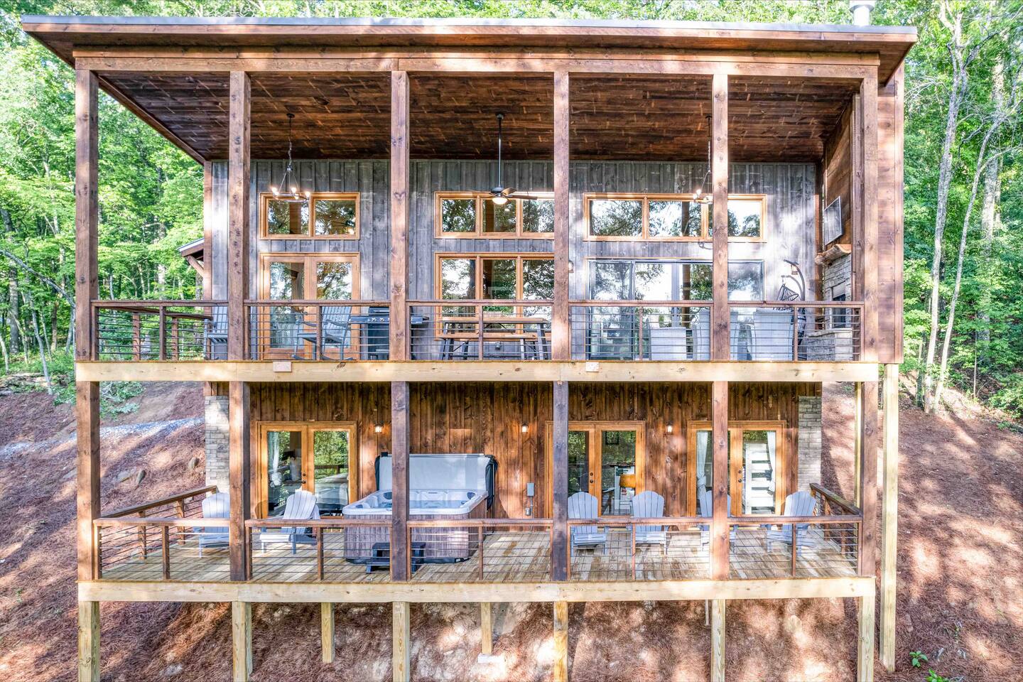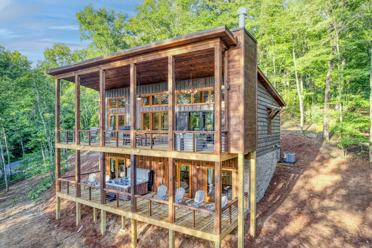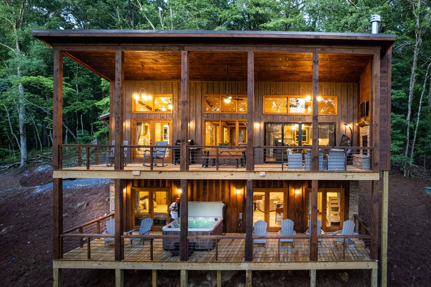 The Bluff Haus is a chalet-style getaway in the Blue Ridge Mountains. Two decks overlook a lush forest – and are the stuff of Appalachian dreams. From an outdoor living room to a hot tub and glowing string lights, our decks are a vacation destination unto themselves. Inside, this new house inspires and comforts you across two floors with a farmhouse vibe, tons of amenities, free EV charging, and large windows with endless tree views.